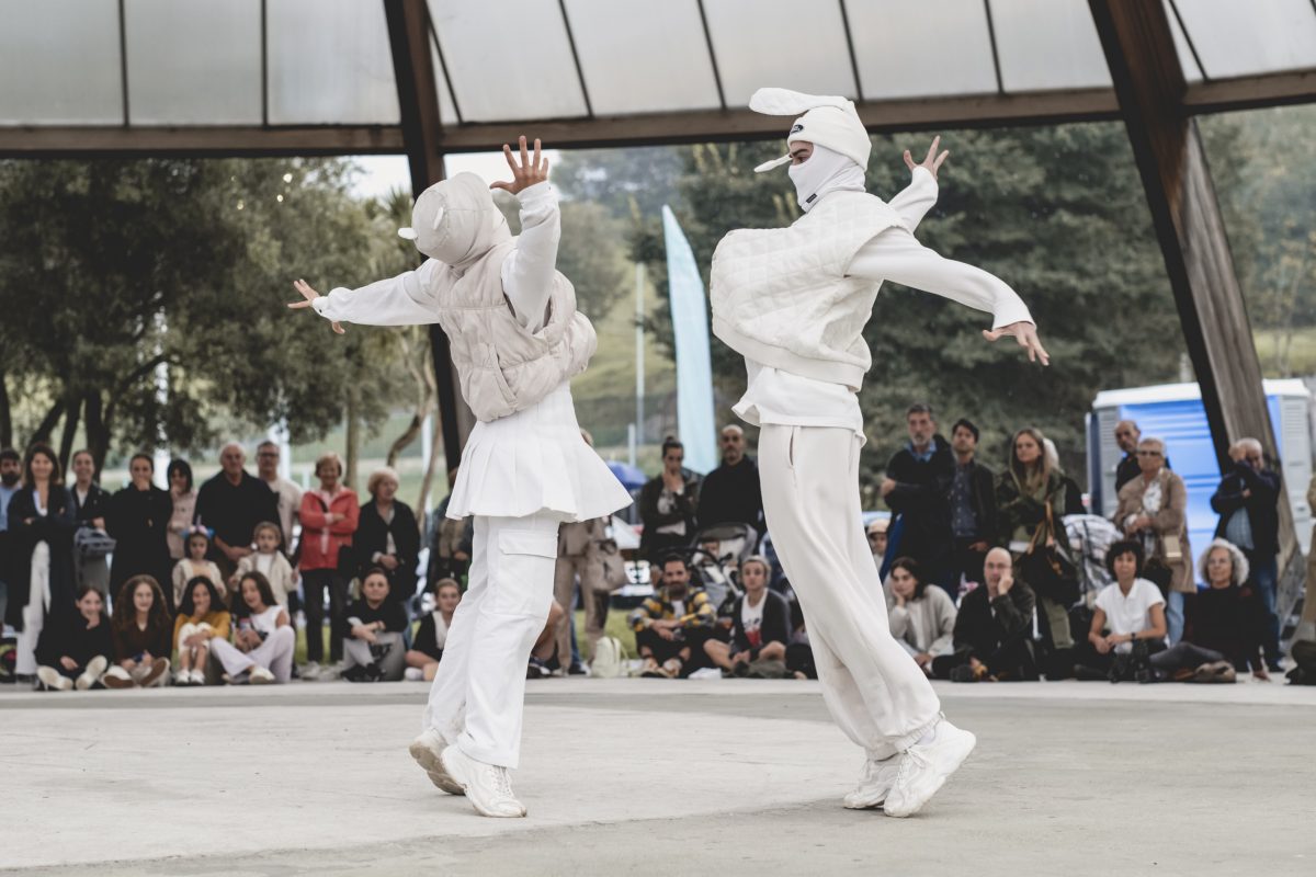 Venimos de un futuro donde la danza en pareja vuelve a formar parte de las nuevas generaciones. Hemos desarrollado una máquina que detecta el tiempo interno de ambas personas involucradas mediante la frecuencia de vibraciones, y crea así una atmósfera común conectando ambas individualidades. Aquí venimos para haceros vibrar, este es nuestro baile de pareja.
