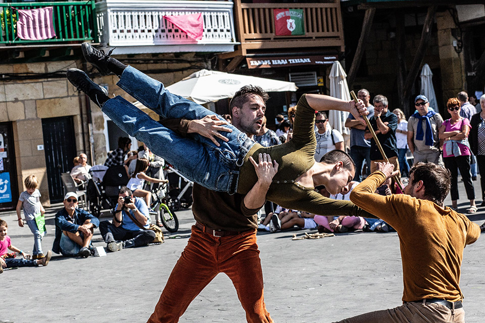 Inspirado en las pruebas de arrastre de bueyes conocidas como IDI-PROBAK en Euskal Herria, recreamos el vinculo entre el animal y el humano, su fisicalidad, la jerarquia y su lenguaje en la plaza. Todo a través de la mirada del animal.